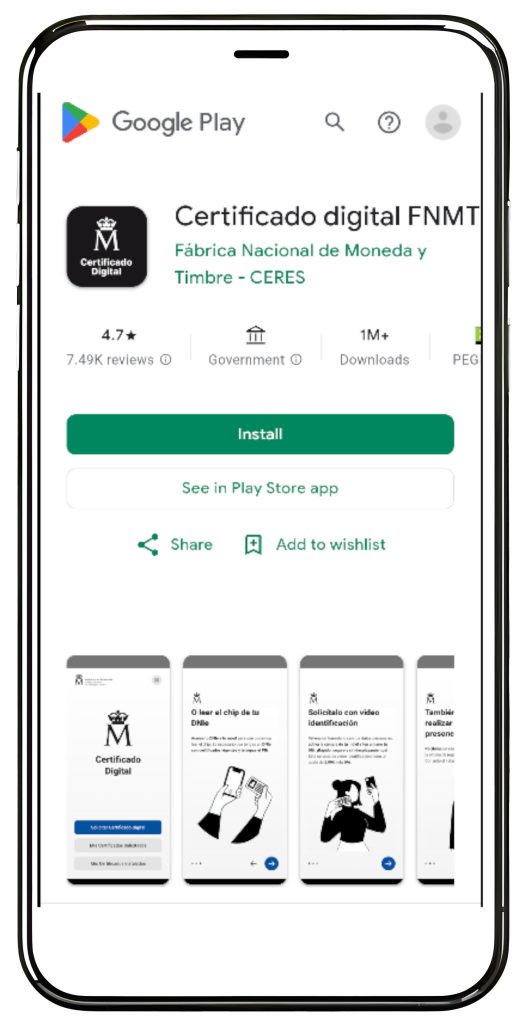 Entrar en la tienda del dispositivo móvil o tablet y buscar “FNMT”, así debería de salir la aplicación que necesitamos para pedir un certificado digital.