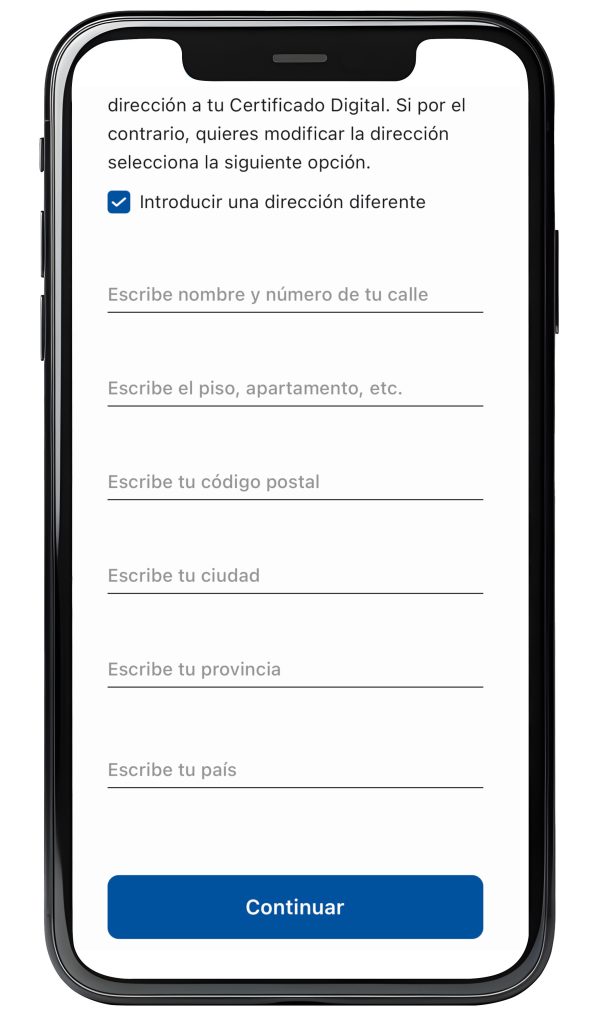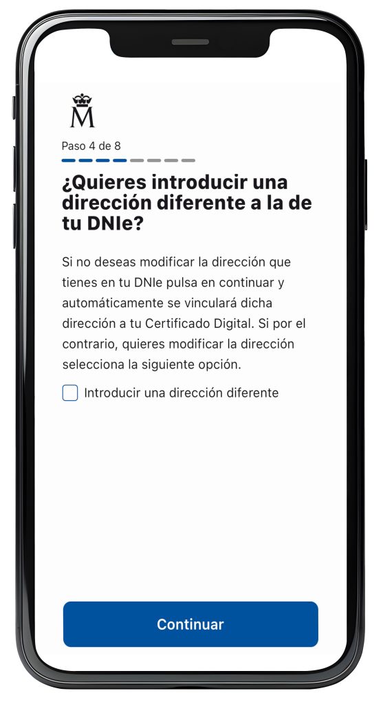En este paso observamos que tenemos la opción de Continuar al siguiente paso, aunque también opción de seleccionar la casilla de introducir una dirección diferente al que haya en el DNI.